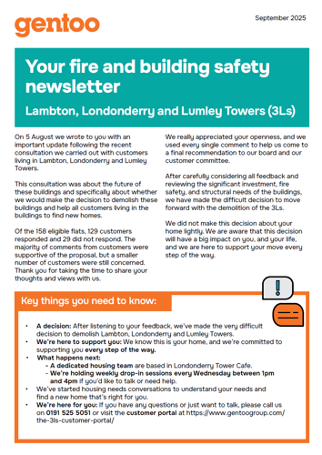 We have included here all previous communication we have sent customers in Lambton, Londonderry and Lumley Towers about the structural investigations and statutory consultation on the buildings.